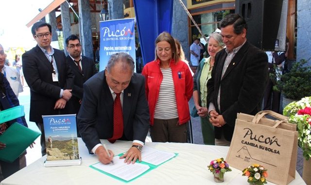 Pucón es la primera ciudad de Chile en iniciar la erradicación del uso de bolsas plásticas en el comercio. Este viernes 29 con la presencia de la Ministra de Medio Ambiente, María Ignacia Benítez, se firmó el protocolo de acuerdo, que da inicio a la segunda etapa de la estrategia, periodo en que los locales comerciales, comenzarán a erradicar de forma paulatina las bolsas, entregando sólo 3 unidades por compra a los clientes.