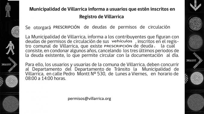Departamento del Tránsito informa Miércoles, 19 Noviembre, 2014 a las 09:26 prensa Actualidad 0 Twitter Facebook LinkedIn WhatsApp Twitter Facebook LinkedIn WhatsApp Relacionado departamento de tránsitoMunicipalidadpermiso de circulaciónVillarrica