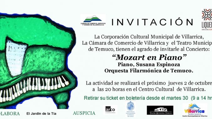 La Corporación Cultural Municipal de Villarrica, La Cámara de Comercio de Villarrica y el Teatro Municipal de Temuco, tienen el agrado de invitarle al Concierto: "MOZART EN PIANO", con la solista Susana Espinoza acompañada de la Orquesta Filarmónica de Temuco.