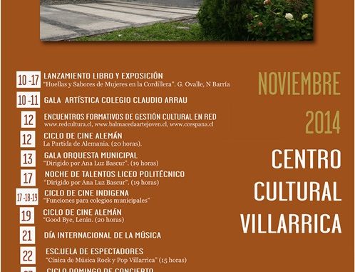 Una entretenida cartelera presenta el Centro Cultural de Villarrica Lunes, 10 Noviembre, 2014 a las 15:36 prensa Cultura y Espectáculos 0 Twitter Facebook LinkedIn WhatsApp Twitter Facebook LinkedIn WhatsApp Relacionado carteleraCentro CulturalnoviembreVillarrica