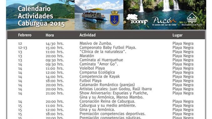 Desde el jueves 12 al 15 de febrero, la comuna de Pucón celebra la Semana Caburguana 2015, jornadas donde se realizarán una serie de actividades culturales y deportivas de una de los balnearios más hermosos de la Araucanía.