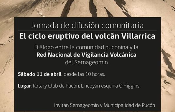 Este sábado 11 de abril se llevará a cabo la jornada de difusión “Ciclo Eruptivo Volcán Villarrica” con la presencia de expertos de la Red Nacional de Vigilancia Volcánica del Servicio Nacional de Geología y Minería (Sernageomin).