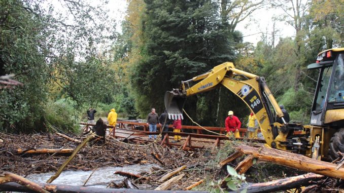 Durante toda la jornada del pasado martes y miércoles, funcionarios de la Municipalidad de Villarrica y vecinos del sector de Villa Alegre, trabajaron en conjunto para despejar el puente recientemente inaugurado que producto de la avalancha de ramas, árboles y troncos, debido a las intensas lluvias, estuvo a punto de colapsar.