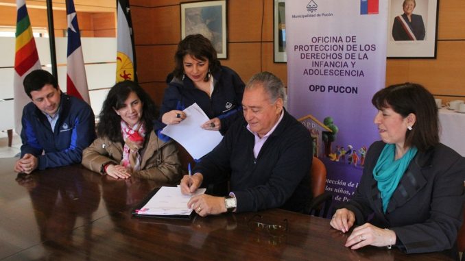 La semana pasada y en el marco del mes de la infancia, se realizó el lanzamiento y la firma del protocolo por parte del alcalde de Pucón, Carlos Barra, la supervisora técnica de la Dirección Regional del Sename Marcela Padilla, la coordinadora de la Oficina de Protección de Derechos de Infancia y Adolescencia (OPD) Miriam Palma y el encargado del departamento de comunicaciones municipal Ignacio Quiroz.