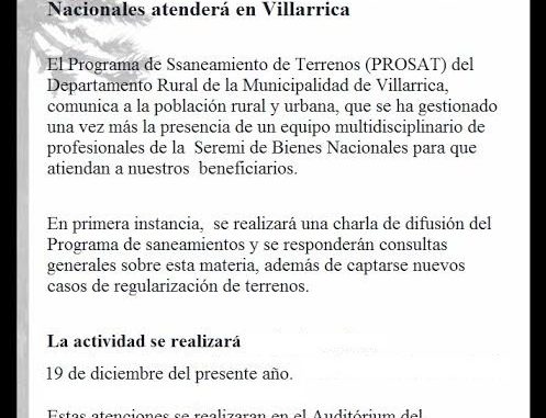 Equipo de la Seremi de Bienes Nacionales atenderá en Villarrica Sábado, 10 Diciembre, 2016 a las 20:34 prensa Comunas 0 Twitter Facebook LinkedIn WhatsApp Twitter Facebook LinkedIn WhatsApp Relacionado Bienes NacionalesseremiVillarrica