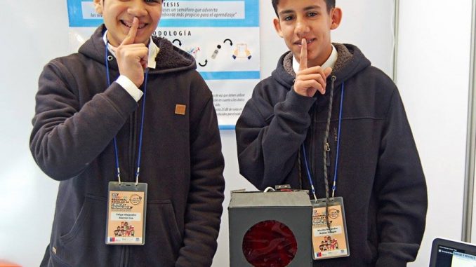 “Semáforo Shhh Shhh para mejorar el ambiente escolar” fue el proyecto tecnológico que se adjudicó el primer lugar en la categoría educación básica, trabajo realizado por Felipe Alarcón y Nicolás Robles, estudiantes de octavo básico de la Fundación Educacional Escuela San Francisco de Asís de Renaico junto a su profesor de ciencias, Sebastián Jara.