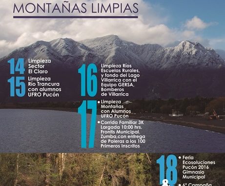 Noviembre en Pucón: Mes de los ríos y montañas limpias Lunes, 24 Octubre, 2016 a las 16:36 prensa Actualidad 0 Twitter Facebook LinkedIn WhatsApp Twitter Facebook LinkedIn WhatsApp Relacionado limpiasMesmontañasnoviembreríos