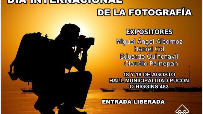 Pucón celebra con exposición Día Nacional de la Fotografía Miércoles, 17 Agosto, 2016 a las 19:00 prensa Cultura y Espectáculos 0 Twitter Facebook LinkedIn WhatsApp El 18 y 19 de agosto, en el hall de la Municipalidad de Pucón, expondrán los fotógrafos Miguel Ángel Albornoz, Haniel Cid, Eduardo Quinchavil y Claudio Painepan. Twitter Facebook LinkedIn WhatsApp Relacionado diafotografíaMunicipalidadPucón