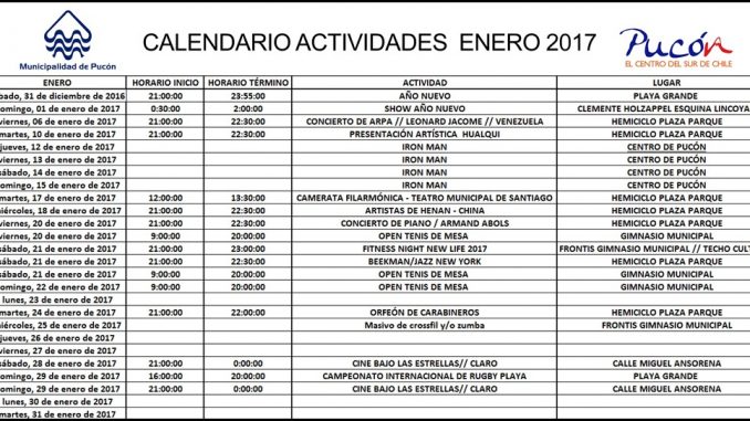 Revisa aquí el calendario de actividades del mes de enero en Pucón Sábado, 31 Diciembre, 2016 a las 00:36 prensa Turismo 0 Twitter Facebook LinkedIn WhatsApp Twitter Facebook LinkedIn WhatsApp Relacionado actividadescalendarioeneroPucón