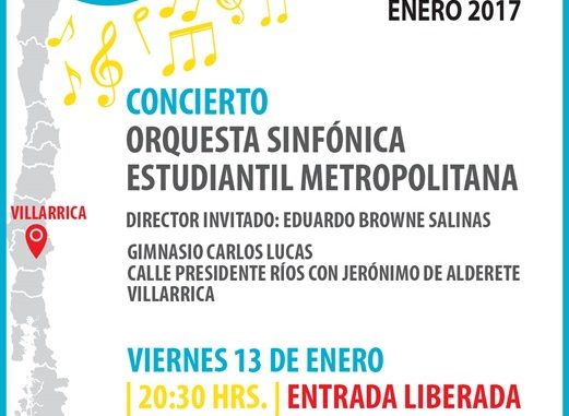 13 de enero: Orquesta Sinfónica Estudiantil Metropolitana se presentará en Villarrica Martes, 10 Enero, 2017 a las 23:15 prensa Cultura y Espectáculos 0 Twitter Facebook LinkedIn WhatsApp Twitter Facebook LinkedIn WhatsApp Relacionado eneroorquestasinfónicaVillarrica