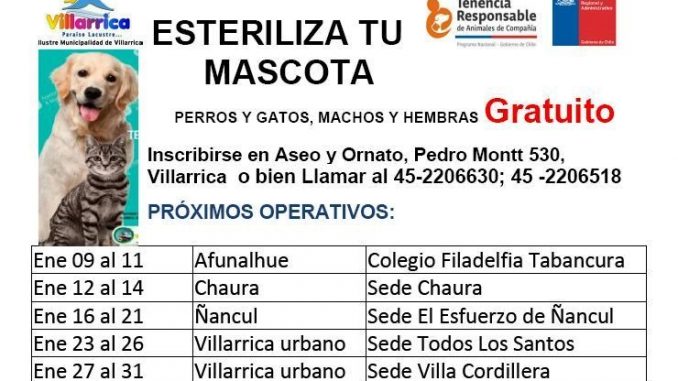 En Villarrica invitan a esterilizar mascotas gratuitamente Lunes, 9 Enero, 2017 a las 23:50 prensa Actualidad 0 Twitter Facebook LinkedIn WhatsApp Twitter Facebook LinkedIn WhatsApp Relacionado esterilizarmascotasVillarrica