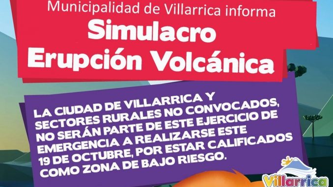 Con el fin de fortalecer los protocolos de alerta en lugares de riesgo de desastres naturales, la Oficina Nacional de Emergencia (ONEMI) junto a los municipio de Villarrica, Pucón y Panguipulli y las instituciones de emergencia de la zona lacustre, han preparando para la mañana de este jueves 19 de octubre un Simulacro de Erupción del Volcán Villarrica en las zonas que rodean el macizo cordillerano.