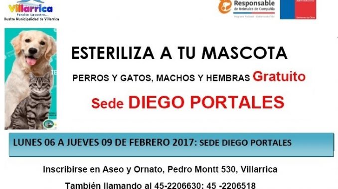 Esterilizaciones gratuitas en Villarrica Lunes, 6 Febrero, 2017 a las 22:40 prensa Comunas 0 Twitter Facebook LinkedIn WhatsApp Twitter Facebook LinkedIn WhatsApp Relacionado esterilizacióngratuitoVillarrica