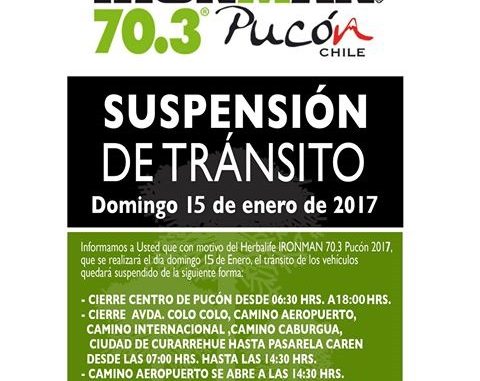 Informan suspensión de tránsito por Ironman Pucón este 15 de enero Martes, 10 Enero, 2017 a las 23:20 prensa Actualidad 0 Twitter Facebook LinkedIn WhatsApp Twitter Facebook LinkedIn WhatsApp Relacionado Ironmantránsito