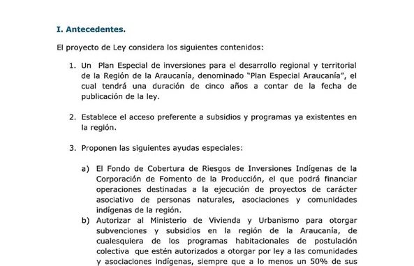 Asimismo, se proponen las siguientes ayudas especiales: a) autorizar al Ministerio de Vivienda y Urbanismo para otorgar subvenciones y subsidios en la región de la Araucanía, de cualesquiera de los programas habitacionales que esté autorizado a otorgar por ley a las comunidades y asociaciones indígenas siempre que a lo menos un 50% de sus integrantes sea indígena; y b) La Comisión Nacional de Riego podrá definir programas especiales para agricultores que cumplan determinados requisitos en la Región.