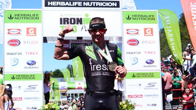 El canadiense de 28 años, que batió récord en el IRONMAN 70.3 de Arizona en noviembre pasado, empezó la largada con un bajo rendimiento en nado, el que él ha admitido, no es su fuerte. Sin embargo, dando una gran sorpresa, en el tramo final de bicicleta logró adelantar a Felipe Van de Wyngard -también embajador de la marca- apareciendo con fuerza y determinación para hacer un excelente trote y correr en primer lugar casi todo el recorrido.