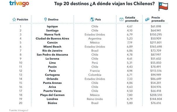 El resto del listado de destinos favoritos por los turistas chilenos, lo componen cuatro ciudades nacionales; Pucón (11), Punta Arenas (15), Arica (16) y Puerto Varas (17), dos destinos europeos; Paris (12) y Londres (19), y cuatro destinos del continente americano; Cartagena de Indias (13), Orlando (14), Playa del Carmen (18) y Búzios (20).