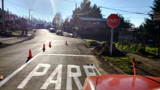 El Departamento de Tránsito de la Municipalidad de Villarrica, instaló recientemente la señal PARE y demarcación correspondiente referido a esta advertencia, en la intersección de calles Presidente Ríos con Anfión Muñoz en Villarrica.