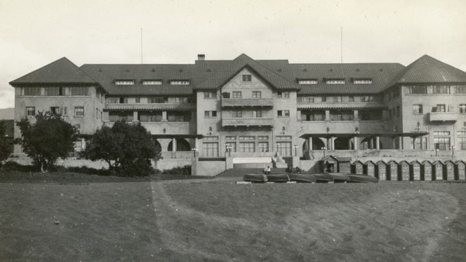 PUCON: En 1935 la Empresa de Ferrocarriles del Estado construye el Gran Hotel Pucón para potenciar e incentivar el turismo lacustre, el que rápidamente se convirtió en uno de los mayores atractivos veraniegos del sur de Chile. Fotografía 1939