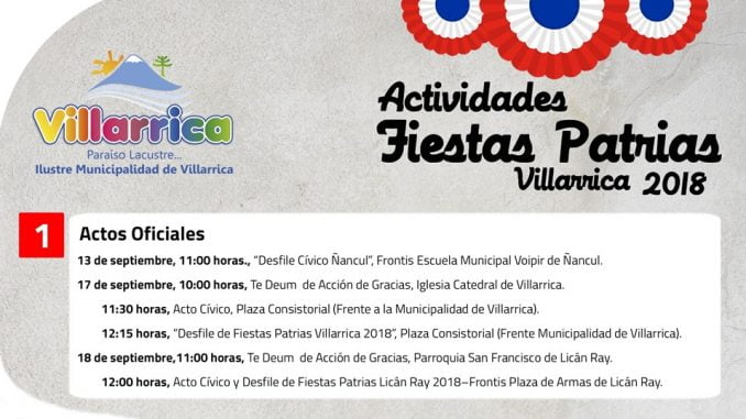 Como ya es una tradición, el Municipio de Villarrica ha organizado para estas celebraciones patrias, un extenso calendario de actividades, diseñado especialmente para que toda la familia villarricense y los miles de turistas que llegan a la comuna lacustre, disfruten de esta fiesta de la chilenidad, que conmemora un nuevo aniversario patrio.