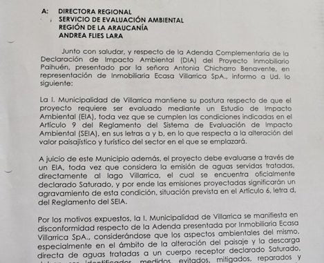 “Como Municipalidad de Villarrica, manifestamos hace bastante tiempo al Servicio de Evaluación Ambiental, nuestra disconformidad en relación a la forma y al tratamiento, especialmente asociado de las aguas servidas, que presentaría este proyecto inmobiliario, situación que hicimos saber a través de dos Oficios enviados en abril y octubre del presente año”, indicó el alcalde Pablo Astete.