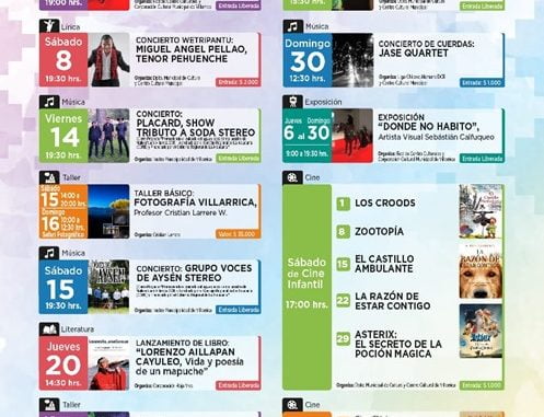 Cartelera cultural de junio en Villarrica Lunes, 3 Junio, 2019 a las 21:11 prensa Cultura y Espectáculos 0 Twitter Facebook LinkedIn WhatsApp Twitter Facebook LinkedIn WhatsApp Relacionado Villarrica
