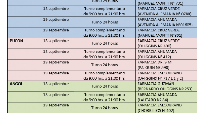 Con motivo del feriado irrenunciable por la celebración de Fiestas Patrias (18 y 19 de septiembre), la Secretaría Regional Ministerial de Salud Araucanía, informa que se dispone de turnos complementarios de farmacia en las comunas de Temuco, Victoria, Villarrica, Pucón y Angol.