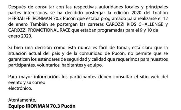 Confirman suspensión de Iron Man Pucón 2020 Jueves, 5 Diciembre, 2019 a las 18:15 prensa Deporte 0 Twitter Facebook LinkedIn WhatsApp Twitter Facebook LinkedIn WhatsApp Relacionado iron manPucón