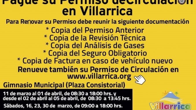A partir del 11 de marzo y hasta el 1 de abril, la renovación de Permisos de Circulación se está realizando sólo en el Gimnasio Municipal, ubicado en calle Pedro de Valdivia N°810, de 08:30 a 18:00 horas y desde el 02 de abril al 05 de abril, de 08:30 a 13:45 horas.