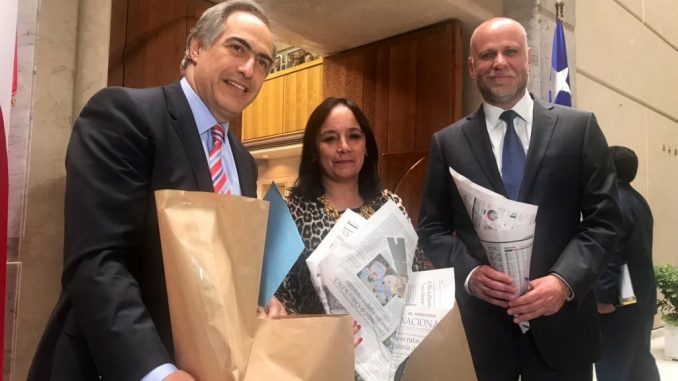 Con bolsas de papel y envoltorios de diario en las manos, los senadores Carmen Gloria Aravena, Francisco Chahuán, Manuel José Ossandón, Álvaro Elizalde y José García Ruminot explicaron la iniciativa que pretende corregir la omisión que contiene el proyecto de Ley vigente hace dos meses y que prohíbe la entrega de bolsas plásticas.