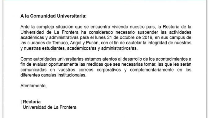 UFRO suspende actividades académicas y administrativas para el lunes 21 de octubre Domingo, 20 Octubre, 2019 a las 12:14 prensa Actualidad 0 Twitter Facebook LinkedIn WhatsApp Twitter Facebook LinkedIn WhatsApp Relacionado UFRO