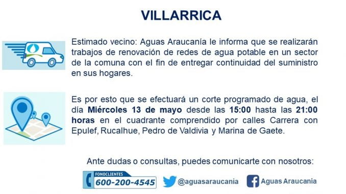 Aviso corte programado de agua en Villarrica Martes, 12 Mayo, 2020 a las 20:35 prensa Comunas 0 Twitter Facebook LinkedIn WhatsApp Twitter Facebook LinkedIn WhatsApp Relacionado Villarrica