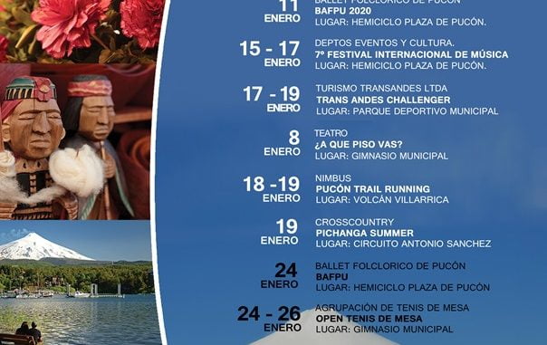 Calendario de actividades Pucón Verano 2020 Viernes, 3 Enero, 2020 a las 15:46 prensa Comunas 0 Twitter Facebook LinkedIn WhatsApp Twitter Facebook LinkedIn WhatsApp Relacionado Pucón