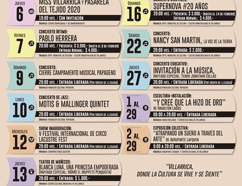 Cartelera Centro Cultural Municipal de Villarrica febrero 2020 Lunes, 3 Febrero, 2020 a las 18:21 prensa Cultura y Espectáculos 0 Twitter Facebook LinkedIn WhatsApp Twitter Facebook LinkedIn WhatsApp Relacionado Villarrica