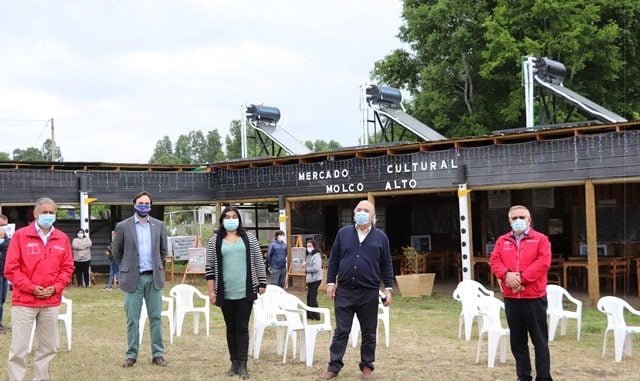Una economía basada en productos locales, puestos en una feria con un entorno favorecido, con gente esforazada y que desde ahora aprovechan el sol para calentar su agua, ofrece la Mercado Cultural Molco Alto, en Villarrica. Erwin Gudenschwager y otras autoridades inauguraron esta obra de Energía Renovable que permite ahorros promedio de 30% en caloríficos a la asociación de empresarias que llevan esta iniciativa.