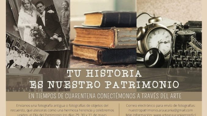 Debido a la crisis sanitaria por el COVID-19, la Red Regional extendió una invitación a compartir historias, afectos y el legado significativo de nuestros antepasados. Para ello, quienes deseen participar de esta iniciativa, deben elegir fotografías antiguas o de objetos del recuerdo, que se mantienen en los hogares como una hermosa herencia y enviarlas con su nombre, comuna y/o sector de residencia, además de un breve relato, que permita conocer el origen de la fotografía, al correo: nuestropatrimonio.araucania@gmail.com