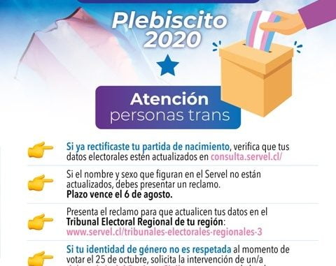 La activista trans del Movilh, Paula Dinamarca, añadió que “el plazo para actualizar los datos vence el jueves 6 de agosto. Lo primero que deben hacer las personas es revisar en Servel.cl si sus datos están actualizados. Si no es así deben, presentar un reclamo en el Tribunal Eelctoral de su región, luego de lo cual se resolverá el problema”.