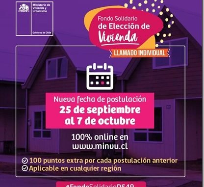 A partir de este viernes 25 de septiembre estará disponible el proceso de postulación al subsidio individual del Fondo Solidario de Elección de Vivienda (DS49), el que estará abierto hasta el próximo 7 de octubre.