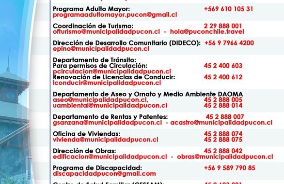 Números de atención del Municipio de Pucón Lunes, 23 Marzo, 2020 a las 18:14 prensa Comunas 0 Twitter Facebook LinkedIn WhatsApp Twitter Facebook LinkedIn WhatsApp Relacionado Pucón