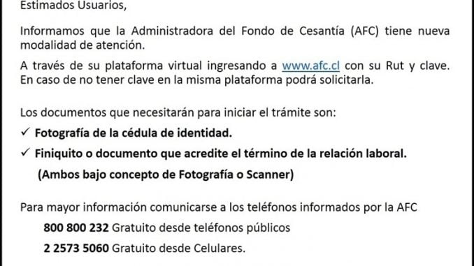 Asimismo, pueden informarse en la plataforma www.afc.cl, con su rut y clave. En caso de no tener clave, la puede solicitar en la misma plataforma.