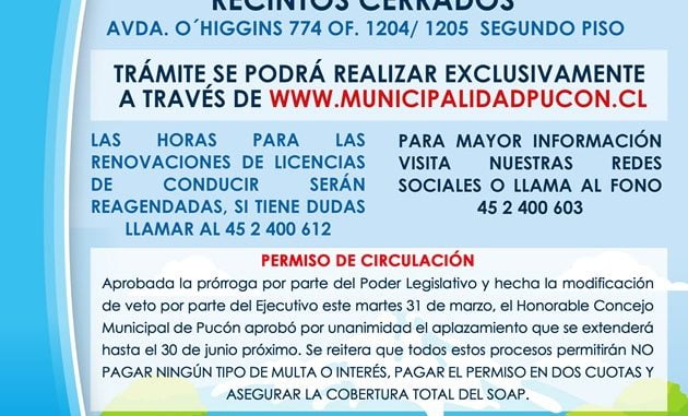Pagos de Permisos de Circulación Pucón Martes, 31 Marzo, 2020 a las 16:22 prensa Comunas 0 Twitter Facebook LinkedIn WhatsApp Twitter Facebook LinkedIn WhatsApp Relacionado permiso de circulaciónPucón
