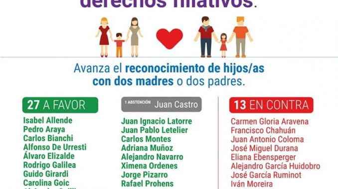 Por 27 votos a favor, 13 en contra y una abstención, el Senado aprobó hoy en general un proyecto de ley que reconoce los derechos filiativos de las parejas del mismo sexo, avance festejado por el Movimiento de Integración y Liberación Homosexual (Movilh).