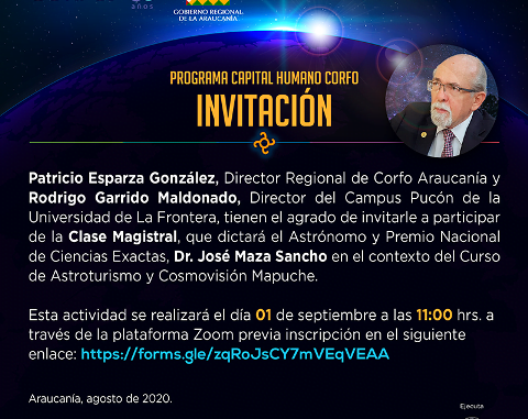 Este martes 1 de septiembre, desde las 11:00 horas se realizará el evento de lanzamiento del curso de Astroturismo y Cosmovisión Mapuche, que contará con la charla magistral del astrónomo y Premio Nacional de Ciencias Exactas, Dr José Maza.