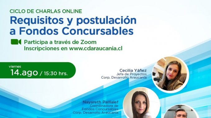 Con el objetivo de asesorar, colaborar y guiar a las personas que quieren ser parte del proceso, la Corporación de Desarrollo Araucanía diseñó una serie de charlas denominada “Requisitos y Postulación a Fondos Concursables”, las que seguirán este viernes, desde las 15:30 horas, por la plataforma Zoom y que contará, en esta oportunidad, con un invitado especial.