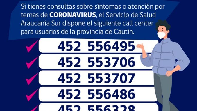 Con el fin de ofrecer más alternativas de comunicación directa para resolver consultas sobre síntomas o atención por temas de Coronavirus, el Servicio de Salud Araucanía Sur habilitó un call center con cinco líneas telefónicas para atender a usuarios de la provincia de Cautín.