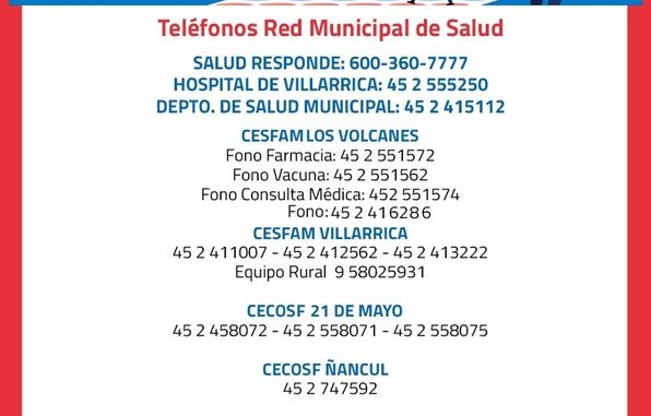 Teléfonos Red Municipal de Salud de Villarrica Martes, 7 Abril, 2020 a las 19:20 prensa Comunas 0 Twitter Facebook LinkedIn WhatsApp Twitter Facebook LinkedIn WhatsApp Relacionado Villarrica