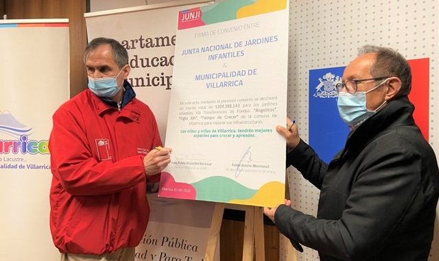 Continua el proceso de mejora de infraestructura de jardines infantiles VTF en la comuna de Villarrica, gracias al programa “subtítulo 33” de JUNJI. En esta oportunidad, para las unidades educativas, “Angelitos”, Siglo XXI”, “Tiempo de Crecer”, Copihues de Volcán” y “Villa Esperanza”. De esta forma, el director de JUNJI Araucanía, Juan Pablo Orlandini y el alcalde de la comuna Pablo Astete, en una ceremonia protocolar, firmaron convenio para el traspaso de fondos por un monto total de, $496.582.053, donde también estuvieron presentes directoras y familias de los cinco jardines infantiles beneficiados.