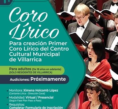 En el marco de la ejecución de los Talleres Artísticos 2021, desarrollados por el Departamento Municipal de Cultura, enfocados a la formación y creación artística de los distintos grupos etarios de Villarrica, se dará inicio al TALLER DE CORO LÍRICO, que tiene dentro de sus objetivos conformar un elenco estable para el Centro Cultural Municipal de Villarrica, que participe en diferentes actividades culturales y artísticas desarrolladas en la comuna, región y el país.