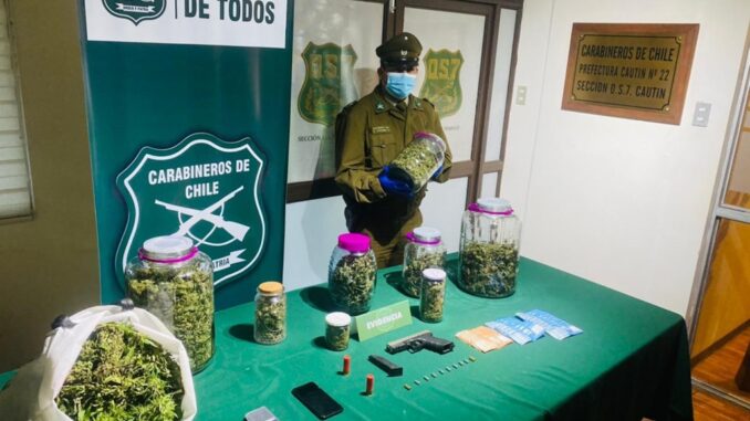 El procedimiento liderado por Carabineros del OS-7 “Araucanía”, se llevó a cabo en calle Vista Volcán, tras información entregada por la comunidad: “el detenido se dedicaba en la comuna al cultivo, elaboración y posterior venta de marihuana en sus distintas denominaciones”, precisó el Capitán Leiva.