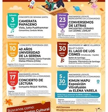 Es así como para este mes de abril se diseñó una variada programación, conmemorando el Aniversario N° 469 de la comuna de Villarrica, la Semana Santa, el Día Mundial del Libro (23 de abril) e Internacional de la Danza (29 de abril).